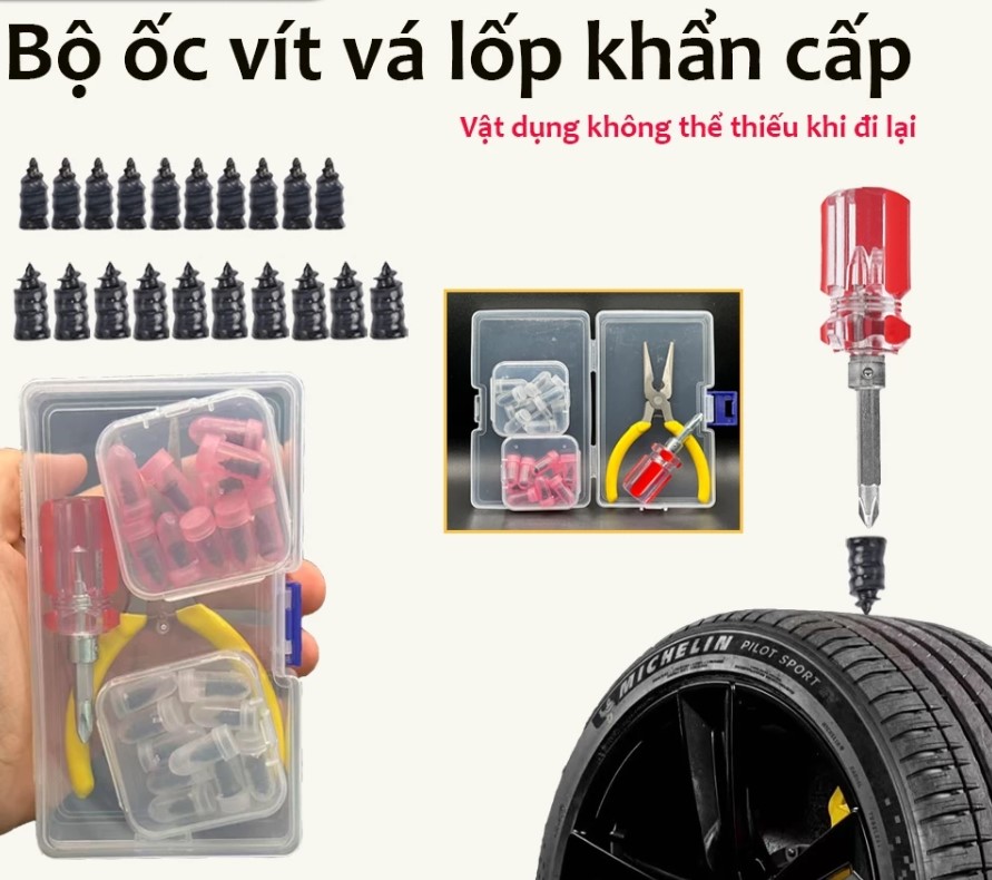 Không còn lo lắng khi gặp phải lốp thủng giữa đường. Bộ ốc vít vá lốp khẩn cấp giúp bạn sửa chữa lỗ thủng nhanh chóng mà không cần tháo lốp, phù hợp cho cả xe ô tô, xe máy với lốp không ruột. Sản phẩm vá lốp khẩn cấp thiết kế tiện lợi, dễ sử dụng và có thể mang theo mọi hành trình.