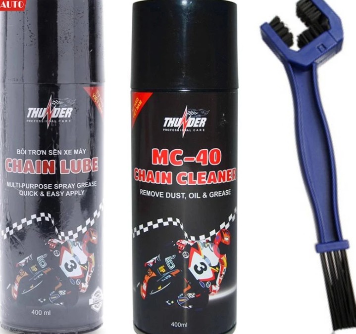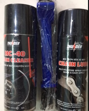 Bộ sản phẩm vệ sinh sên MC-40 400ml, bôi trơn dưỡng sên Thunder 400ml và bàn chải sên là giải pháp chăm sóc sên xe máy toàn diện, giúp làm sạch, bôi trơn và bảo vệ hệ thống truyền động hiệu quả.