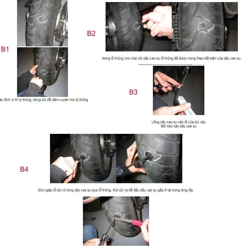 Rút dùi thật nhẹ nhàng, để lại phần dây cao su nằm bên trong lòng lốp.
