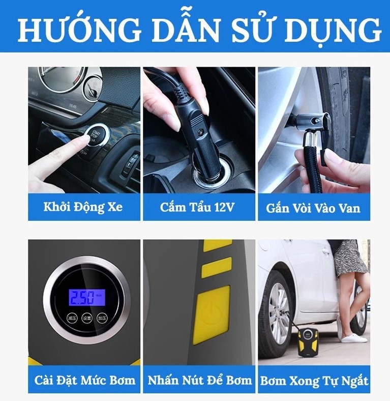 Ấn nút bơm → Máy sẽ hoạt động và tự động dừng khi đạt đúng mức đã cài, tránh bơm quá căng gây nổ lốp hoặc hỏng van.