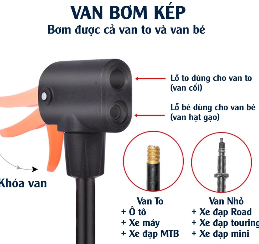 Đầu van đa năng: Phù hợp với van xe đạp (van hạt gạo), van xe máy, ô tô, đồng thời có thể sử dụng để bơm bóng, đồ chơi hơi, nệm hơi…