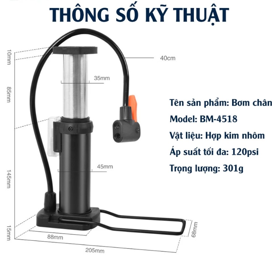 Bơm áp lực cao – nhanh chóng: Cấu tạo tối ưu giúp bơm nhanh, lượng khí lớn, tiết kiệm sức lực, phù hợp cho cả xe đạp, xe máy và ô tô.