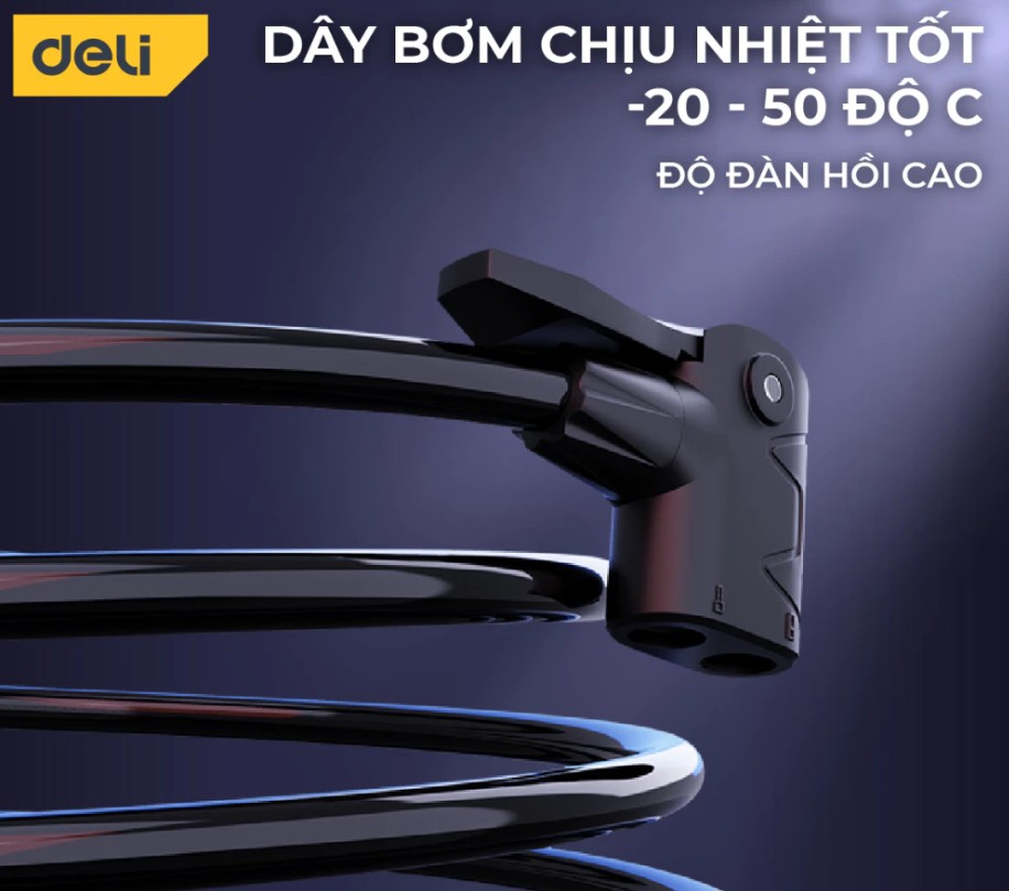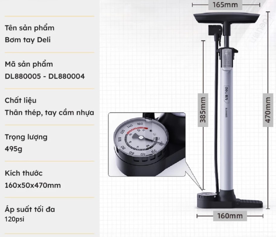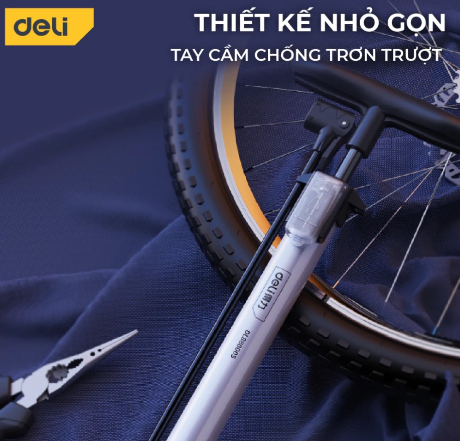 Bơm xe Deli Tools cho xe máy xe đạp là lựa chọn lý tưởng cho những ai cần một thiết bị bơm hơi nhỏ gọn nhưng mạnh mẽ. Với khả năng bơm lên đến 160 PSI, đầu van đa năng và đồng hồ đo áp suất tích hợp, sản phẩm phù hợp cho xe đạp, xe máy, bóng thể thao, phao bơi và các vật dụng hơi khác.