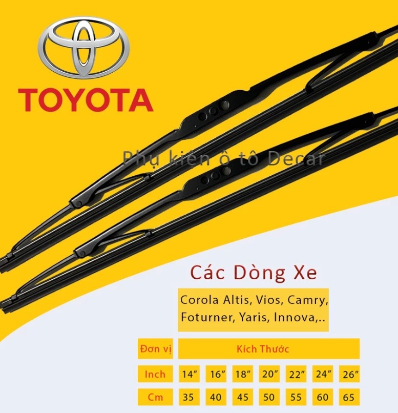 DECAR Auto giới thiệu mẫu gạt mưa thân cứng, khung sắt chất lượng cao, thiết kế hiện đại, giá cả hợp lý, phù hợp với tất cả các dòng xe Toyota.