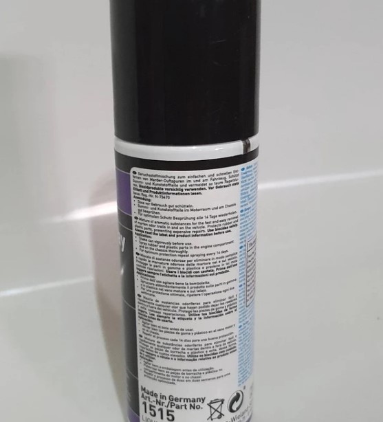 LIQUI MOLY Marten Spray 1515 là giải pháp chuyên nghiệp để bảo vệ khoang máy ô tô, xe máy khỏi sự xâm nhập và phá hoại của chuột và các loại gặm nhấm khác. Sản phẩm giúp ngăn chặn chuột cắn phá dây điện, cao su, nhựa và các linh kiện nhạy cảm, hạn chế hư hỏng, chập điện, và các rủi ro an toàn khi vận hành.