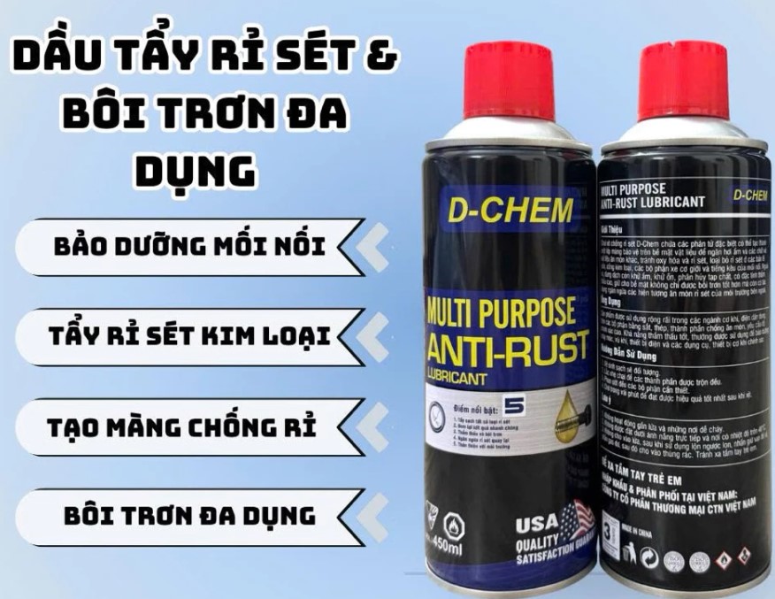 D-CHEM AntiRust 450ml là giải pháp đa năng tẩy rỉ sét, bôi trơn và bảo vệ kim loại trong gia đình, gara, xưởng cơ khí hay công nghiệp. Sản phẩm giúp loại bỏ nhanh vết rỉ, nới lỏng các khớp nối bị kẹt, giảm ma sát và bảo vệ bề mặt kim loại chống oxy hóa, ăn mòn lâu dài. Với công thức cải tiến, chai xịt không có mùi dầu khó chịu, dễ sử dụng mà không cần tháo rời chi tiết.