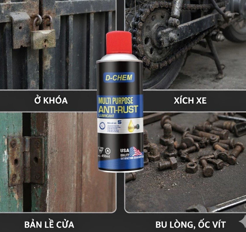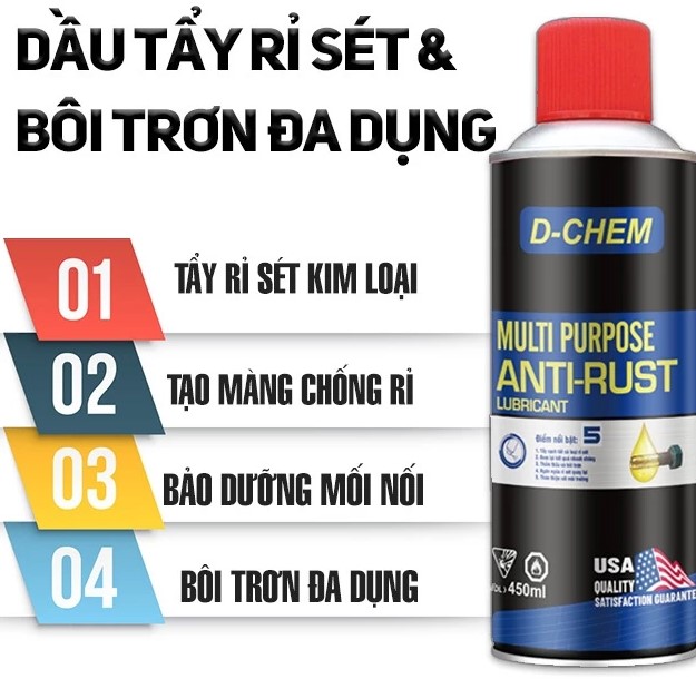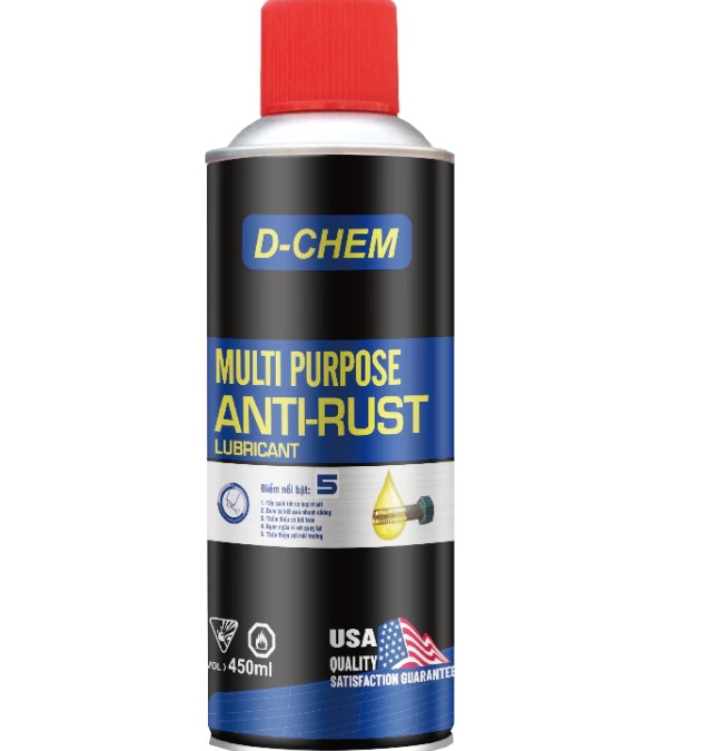 D-CHEM AntiRust 450ml là chai xịt tẩy rỉ sét và bôi trơn đa dụng, được thiết kế nhằm xử lý nhanh các vấn đề thường gặp ở kim loại như rỉ sét, ma sát cao, khớp nối bị kẹt. Sản phẩm giúp làm sạch, bôi trơn và bảo vệ bề mặt kim loại chỉ trong thời gian ngắn, không cần tháo rời chi tiết, sử dụng tiện lợi và hiệu quả.