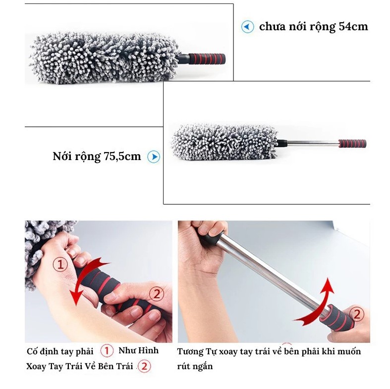 Sản phẩm được thiết kế thông minh, kết hợp giữa đầu chổi bằng sợi quang dầu polymer tổng hợp cao cấp và cán kim loại dài có thể điều chỉnh linh hoạt, giúp việc làm sạch mọi ngóc ngách trở nên dễ dàng, nhanh chóng mà không làm trầy xước bề mặt.