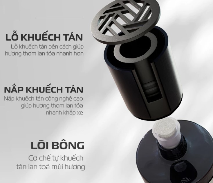 Khử mùi hiệu quả: Loại bỏ nhanh các mùi hôi trong khoang xe như mùi ẩm, mùi da mới, mùi đồ ăn hay mùi điều hòa cũ.