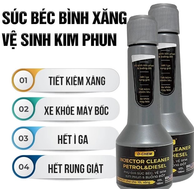 Combo 2 chai súc béc – vệ sinh kim phun D-Chem là giải pháp bảo dưỡng động cơ đơn giản nhưng mang lại hiệu quả rõ rệt. Với khả năng làm sạch hệ thống nhiên liệu, cải thiện hiệu suất vận hành và bảo vệ động cơ lâu dài, sản phẩm phù hợp cho cả người dùng cá nhân lẫn gara, thợ sửa chữa chuyên nghiệp. Sử dụng định kỳ giúp xe luôn vận hành êm ái, tiết kiệm nhiên liệu và kéo dài tuổi thọ động cơ theo thời gian.