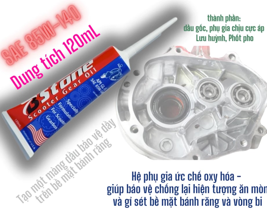 BSTONE GL5 85W140 là dòng dầu hộp số tay ga đạt tiêu chuẩn GL5 cao cấp, chuyên dùng cho các xe có hiện tượng hú láp, rít láp hoặc vận hành kém êm. Sản phẩm được đóng gói dạng tuýp 120mL tiện lợi, dễ sử dụng khi bảo dưỡng định kỳ hoặc thay dầu láp tại nhà hay tiệm sửa xe.