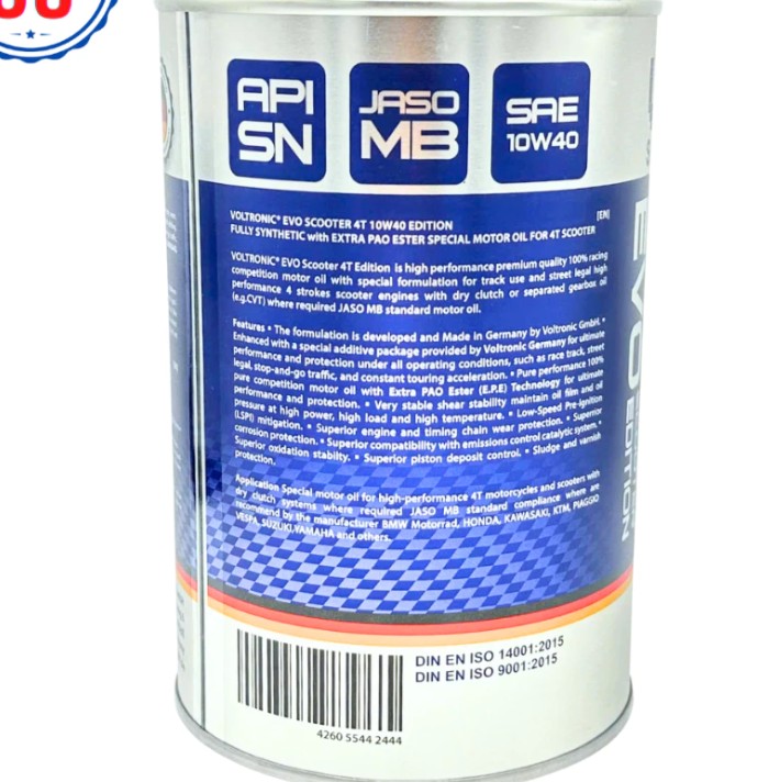 Dầu nhớt Voltronic Evo Scooter 10W40 được đánh giá cao nhờ công nghệ Extra PAO Ester và nền dầu tổng hợp nhập khẩu từ Đức. Sản phẩm đáp ứng tốt các yêu cầu về độ bền, khả năng bảo vệ và hiệu suất vận hành, phù hợp với xe tay ga đời mới cần dầu nhớt chất lượng cao.