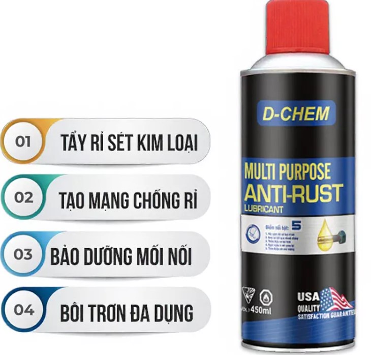 Dầu tẩy rỉ sét và bôi trơn đa dụng D-Chem Anti Rust 450ml là lựa chọn lý tưởng cho những ai cần một giải pháp bảo dưỡng kim loại hiệu quả, tiện lợi và an toàn.