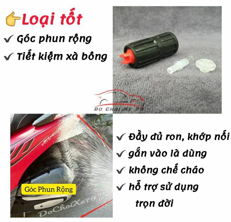 Tạo bọt mịn, đều: Đầu vòi thiết kế đặc biệt giúp biến dung dịch rửa xe thành bọt tuyết dày mịn, bám đều trên bề mặt, dễ dàng loại bỏ bụi bẩn, bùn đất và dầu mỡ.