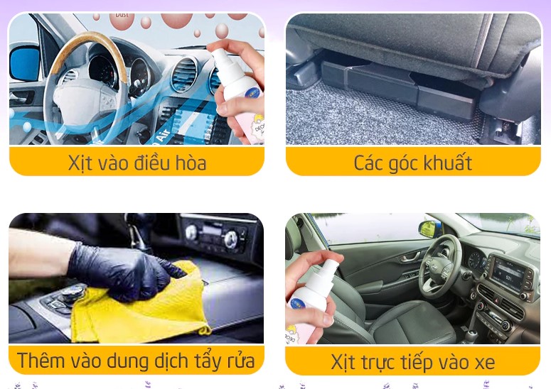 Để đạt hiệu quả tốt nhất, bạn nên xịt trực tiếp dung dịch vào các vị trí dễ phát sinh mùi như ghế ngồi, thảm sàn, trần xe và khu vực cửa gió điều hòa. Việc xác định đúng nguồn gây mùi và xử lý trực tiếp sẽ giúp mùi hôi được loại bỏ triệt để hơn.
