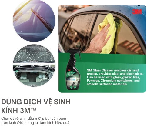 Dung dịch vệ sinh kính 3M PN38191LT có công thức chuyên dụng, nhẹ nhàng nhưng hiệu quả cao, giúp làm sạch nhanh chóng mà không gây trầy xước hay ăn mòn bề mặt kính. Sản phẩm hoàn toàn an toàn với các lớp phủ chống nắng, phim cách nhiệt trên kính ô tô, đồng thời phù hợp với cả gương và kính cửa sổ trong nhà hoặc văn phòng.