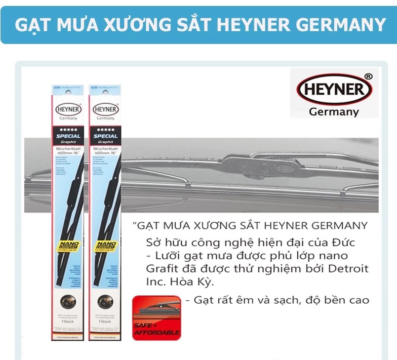 Gạt mưa ô tô Heyner Germany Special là sản phẩm cao cấp nhập khẩu từ Đức, thiết kế dành riêng cho các xe sử dụng ngàm móc U. Với chất liệu cao su tự nhiên phủ Nano Graphite, bộ gạt mưa mang đến hiệu suất lau sạch tối ưu, tuổi thọ lâu dài và hoạt động êm ái, giúp kính lái luôn trong suốt và an toàn trong mọi điều kiện thời tiết.