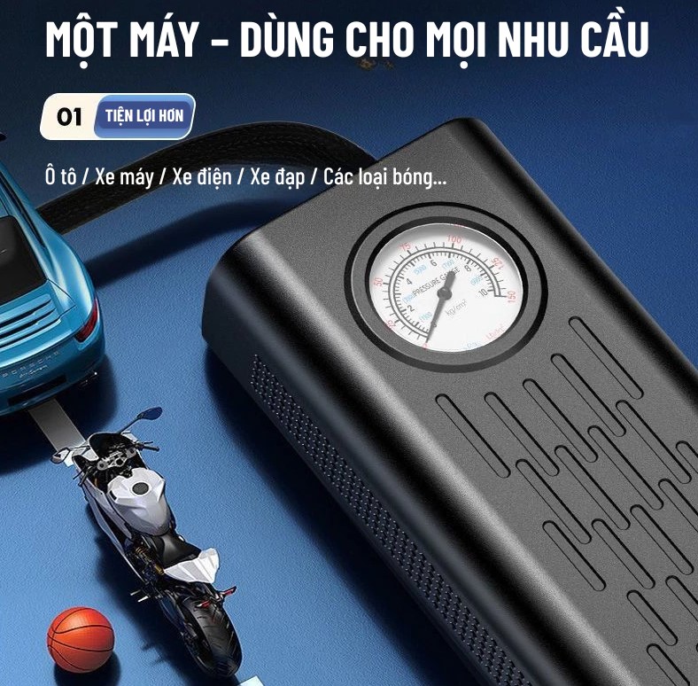 Sử dụng cho xe ô tô, xe máy, xe đạp, bóng đá, phao hơi, đồ chơi bơm hơi,… với nhiều đầu nối kèm theo.