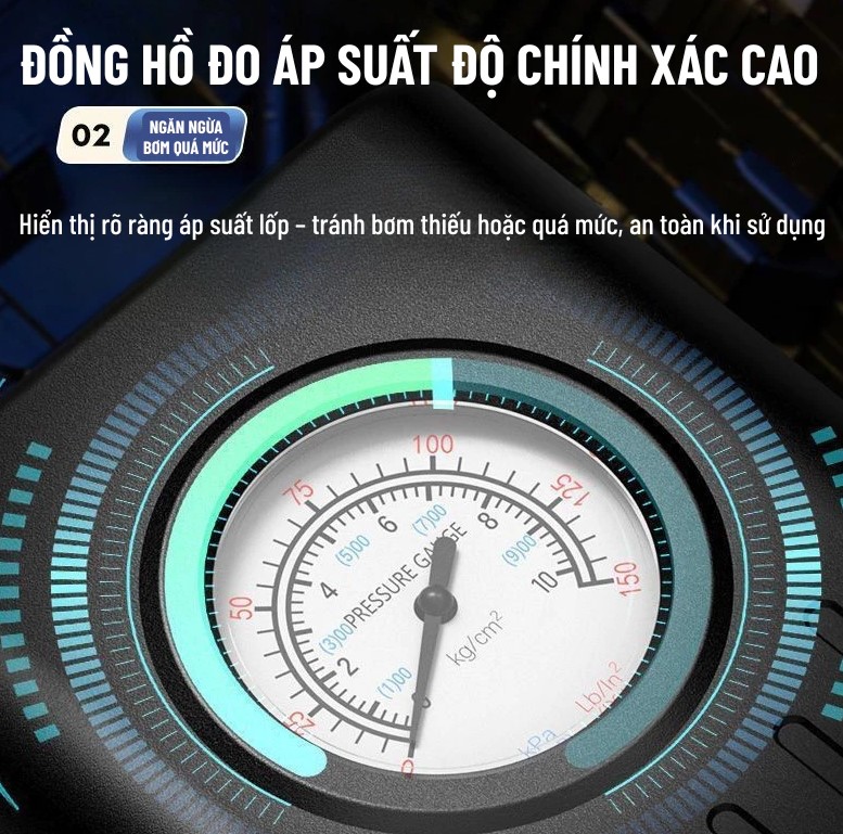 Màn hình LCD hiển thị áp suất lốp rõ ràng, dễ quan sát, tự động ngắt khi đạt áp suất cài đặt – đảm bảo an toàn tuyệt đối, không lo bơm quá căng.