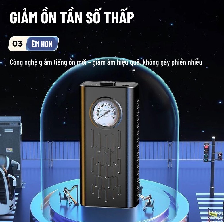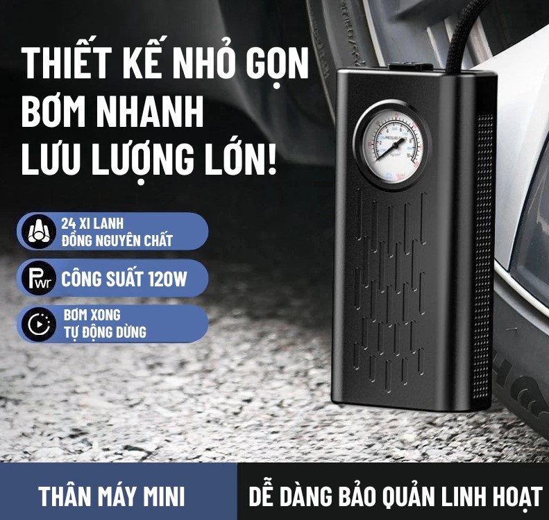 Công suất 120W, lưu lượng 70L/phút, giúp bơm đầy 1 lốp ô tô chỉ trong vài phút – tiết kiệm thời gian hơn gấp 3 lần so với bơm truyền thống.