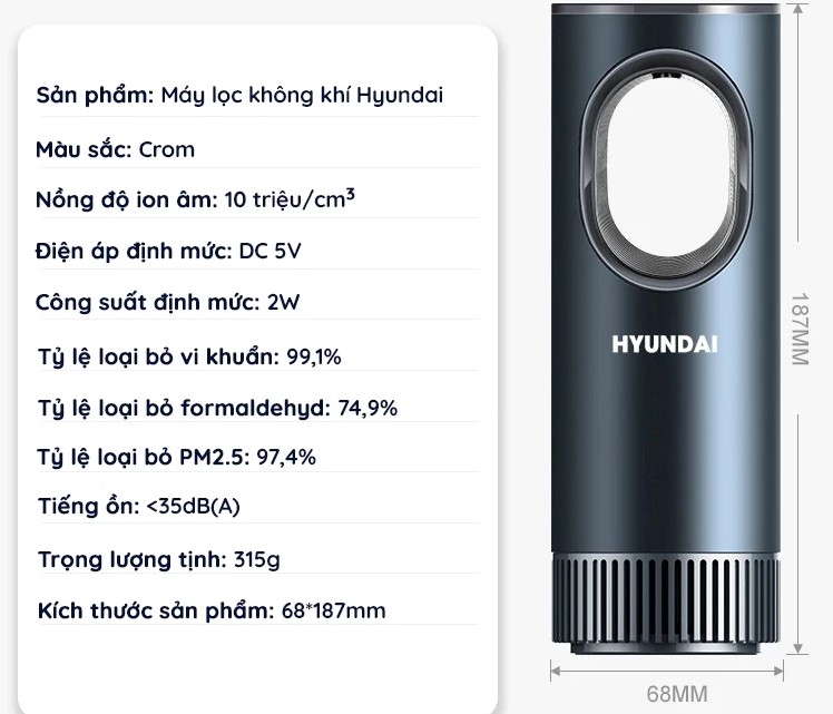 Máy lọc không khí ô tô Hyundai là giải pháp toàn diện giúp lọc bụi mịn, khử mùi, diệt khuẩn và cải thiện chất lượng không khí bên trong xe một cách hiệu quả. Với công nghệ lọc HEPA 13 tiên tiến, khả năng tạo ion âm cùng thiết kế sang trọng, sản phẩm không chỉ bảo vệ sức khỏe mà còn nâng cao trải nghiệm lái xe, mang lại sự an tâm và thoải mái cho bạn và những người thân yêu trên mọi cung đường.
