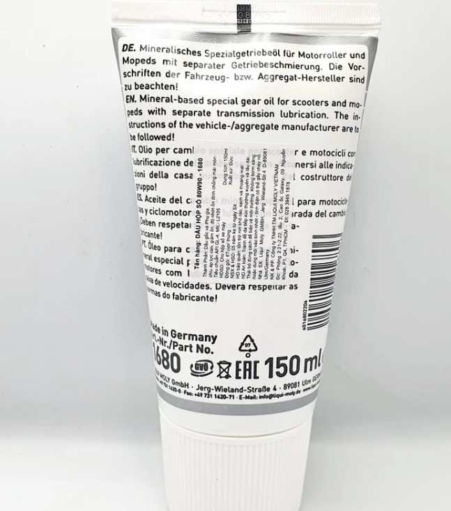 Nhớt hộp số (nhớt láp) Liqui Moly 80W90 150ml là dòng dầu chuyên dụng cao cấp dành riêng cho xe tay ga đời mới và xe tay ga cao cấp, được nghiên cứu và sản xuất bởi Liqui Moly – thương hiệu dầu nhớt hàng đầu đến từ Đức. Sản phẩm được thiết kế nhằm bảo vệ tối ưu bộ truyền động bánh sau, giúp xe vận hành êm ái, giảm tiếng hú láp và duy trì hiệu suất ổn định trong suốt quá trình sử dụng.