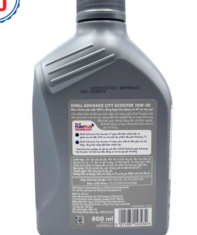 Nhớt xe tay ga Shell Advance City Scooter API SP 10W30 – 10W40 sản xuất tại Thái Lan là giải pháp bôi trơn hiệu quả cho động cơ xe tay ga hiện đại. Với công nghệ Shell PurePlus và Active Cleansing, sản phẩm giúp động cơ sạch hơn, vận hành êm ái và tiết kiệm nhiên liệu rõ rệt.
