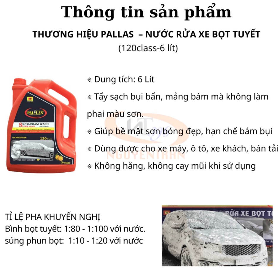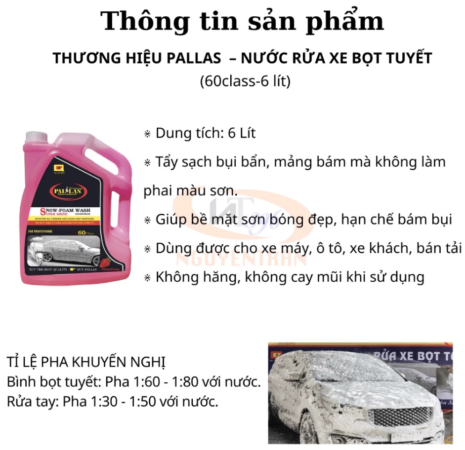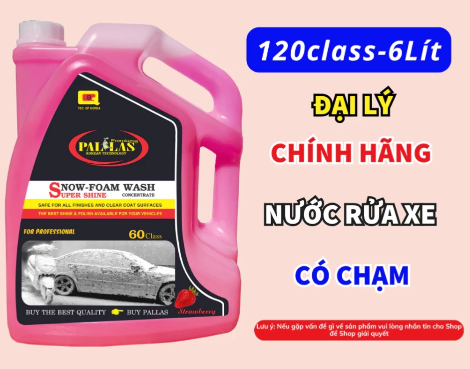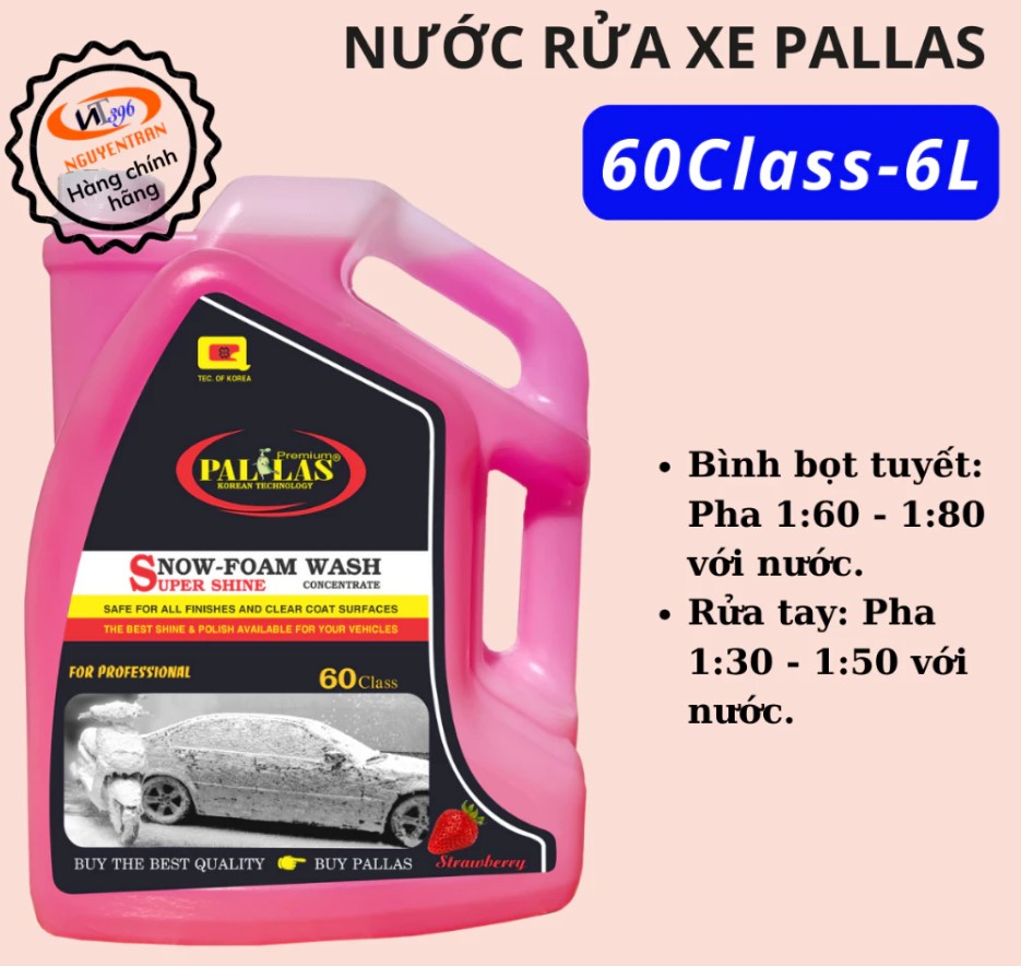 Nước rửa xe bọt tuyết Pallas 60 – 6L là dung dịch rửa xe chuyên dụng với công nghệ Hàn Quốc, giúp làm sạch nhanh chóng, tạo bọt dày mịn và mang lại độ bóng vượt trội cho sơn xe. Sản phẩm được ưa chuộng tại các tiệm rửa xe chuyên nghiệp và cả người dùng cá nhân bởi khả năng tạo bọt tuyết nhiều, tiết kiệm và an toàn cho bề mặt sơn.