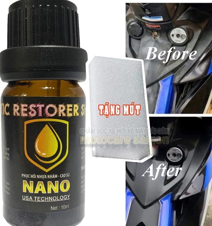Nano Plastic Restorer 10ml là dung dịch chuyên dụng giúp phục hồi và dưỡng nhựa nhám, nhựa đen cho mọi dòng xe ô tô và xe máy. Sản phẩm giúp làm mới bề mặt nhựa bị phai màu, bạc trắng do nắng mưa và thời gian sử dụng, mang lại màu đen tự nhiên, đều màu và sạch đẹp như ban đầu. Với công thức nano tiên tiến, dung dịch không chỉ cải thiện thẩm mỹ mà còn tạo lớp bảo vệ giúp nhựa bền màu, hạn chế lão hóa và tác động từ môi trường.