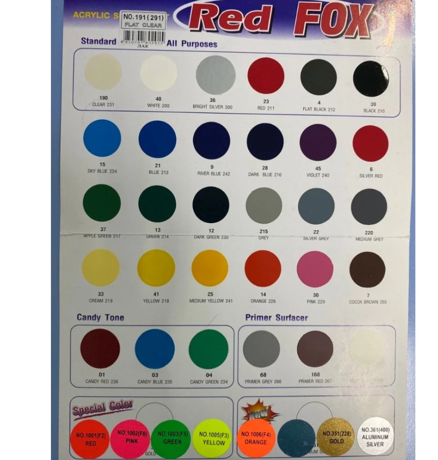 Sơn xịt Red Fox là dòng sơn cao cấp đến từ RJ London Chemical Industry Co., Ltd (Thái Lan), nổi tiếng nhờ khả năng bám dính vượt trội, độ phủ đẹp và bảng màu đa dạng đáp ứng mọi nhu cầu trang trí – sửa chữa cho gia đình, công nghiệp và DIY.