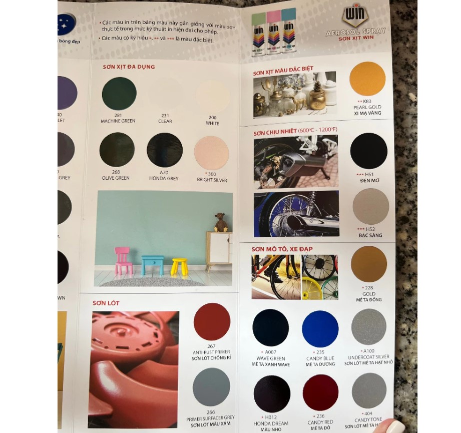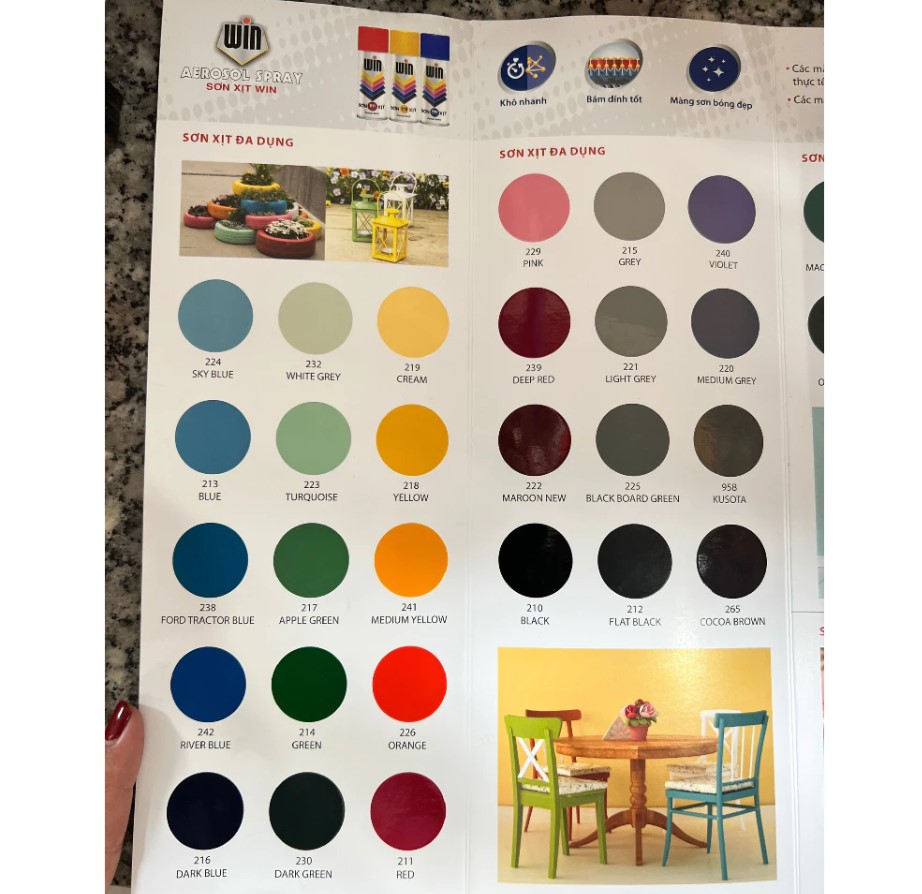 Bảng màu: Đầy đủ các màu theo catalogue của WIN SPRAY.