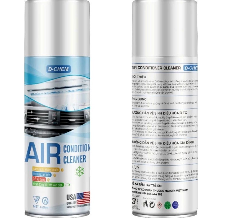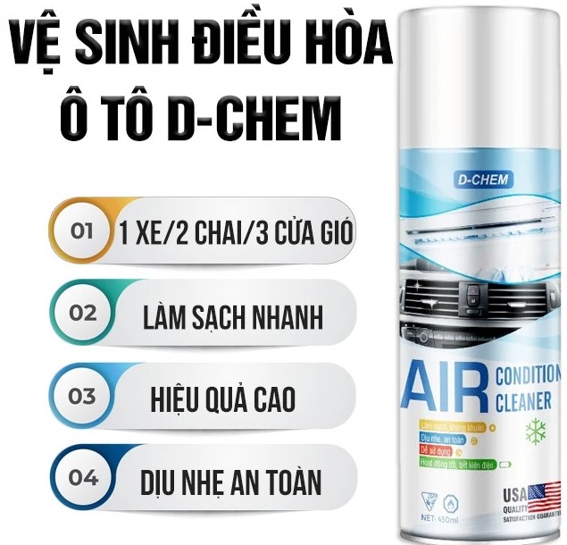 Dung dịch vệ sinh điều hòa, dàn lạnh ô tô D-Chem được nghiên cứu nhằm làm sạch nhanh hệ thống điều hòa mà không cần tháo lắp, giúp khử mùi, diệt khuẩn và trả lại luồng gió mát trong lành. Sản phẩm phù hợp cho người dùng muốn tự vệ sinh điều hòa tại nhà, tiết kiệm thời gian và chi phí so với việc ra gara.
