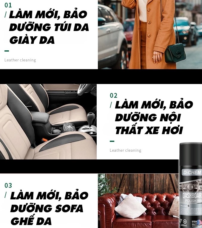 Dù bạn sở hữu một chiếc áo da hàng hiệu hay sản phẩm da bình dân, chai xịt D-Chem sẽ giúp làm mới bề mặt da, phục hồi độ mềm mại, sáng bóng tự nhiên, đồng thời để lại lớp màng bảo vệ trong suốt chống thấm nước và bụi bẩn.