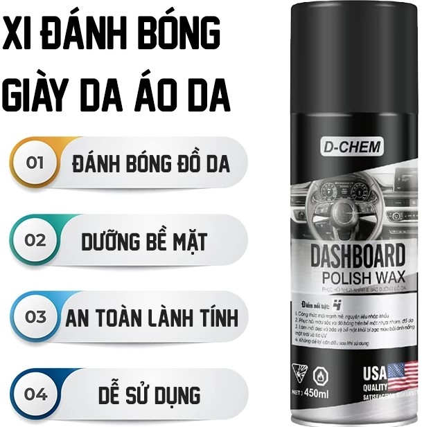 Xi đánh bóng D-Chem 450ml là giải pháp chăm sóc chuyên nghiệp dành cho các sản phẩm từ da thật, da lộn, giày da, áo da, hay các bề mặt nhựa và giả da. Sản phẩm giúp vệ sinh, dưỡng ẩm, bảo vệ và đánh bóng các bề mặt da, ngăn chặn tình trạng mốc, nổ da, bám bụi và giảm hao mòn.
